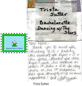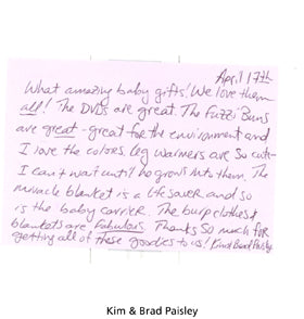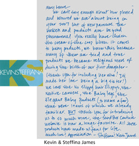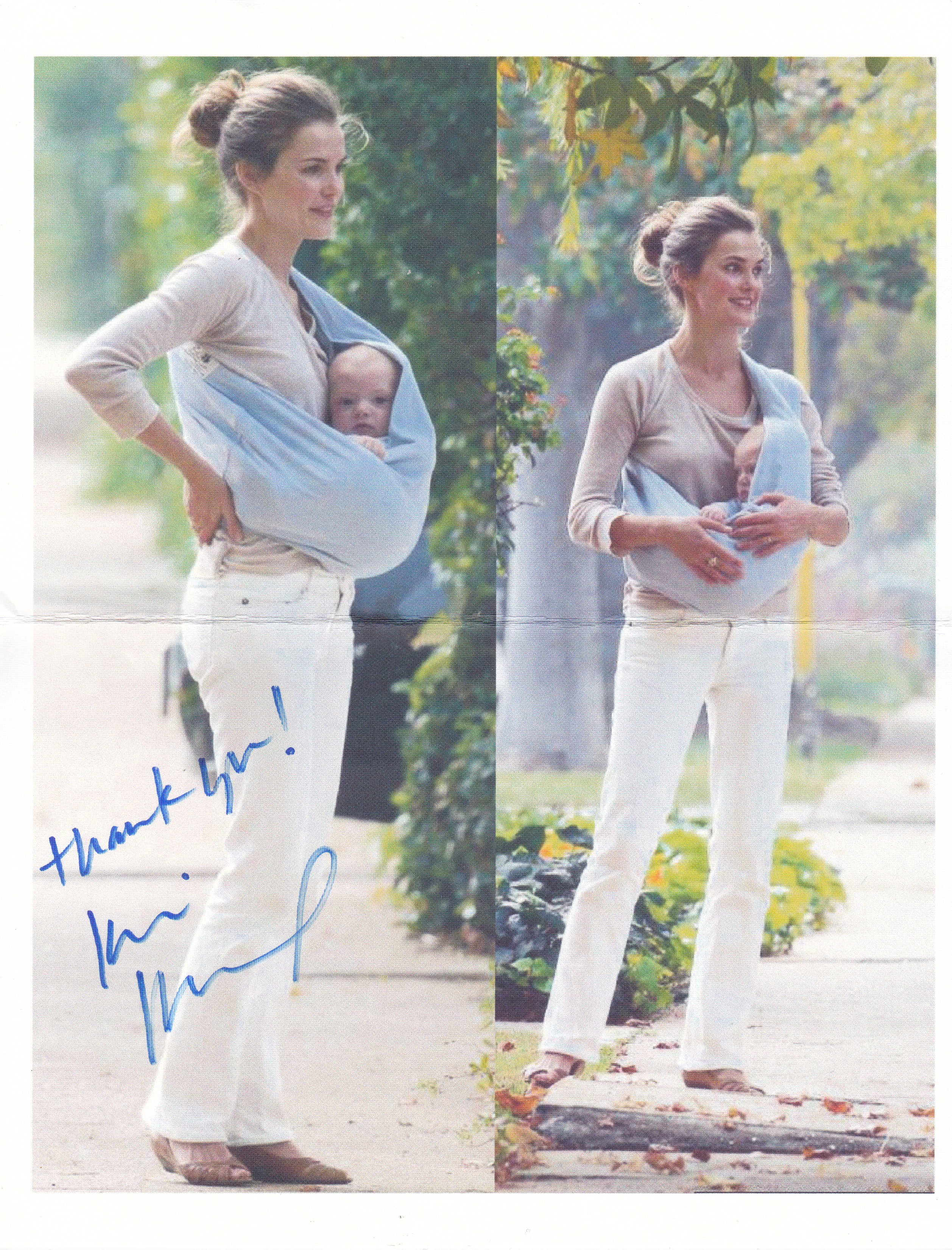 "My husband Mark-Paul Gosselaar and myself would like to say thank you very much for the wonderful gift baskets. That was a nice surprise not only for my new addition Ava, but for my son Michael as well. All of the gifts have been very useful. And we use the baby carriers often. The blankets and burp cloths and Robeez are great! Thank you very much for thinking of us."